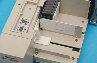 Die beiden Buchstaben des Namens SF-200 stehen für Slide Feeder. Es ist ein Zubehör des Nikon LS-2000 oder LS-4000, das automatisch bis zu 50 Dias im Scanner austauscht. Der Stapelscanvorgang mit gerahmten Dias ist nicht immer problemlos. Rahmen mit ca. 2mm Dicke und leicht gerundeten Seiten lassen sich gut verarbeiten. Die Zufuhreinheit neigt jedoch dazu, andere Dias nicht richtig zu transportieren oder zu verkanten. Dann bleibt alles stehen. Man sollte stets auf die Geräusche des Scanners hören. Wenn man nichts hört, ist er (wieder mal) stehengeblieben. Ein hohes Motorgeräusch deutet darauf hin, daß er vergeblich mit einem verklemmten Dia kämpft. Ob das für den Feeder gut ist? Man muß den Diarahmen aus dem empfindlichen Mechanismus herausfummeln und den Vorgang neu starten. Das setzt handwerkliches Geschick voraus, da die verkanteten Dias ziemlich unglücklich im empfindlichen Mechanismus stecken. Das ist nichts für ungeduldige Gemüter. Ich kenne Leute, die den SF-200 innerhalb kürzester Zeit beschädigen würden.