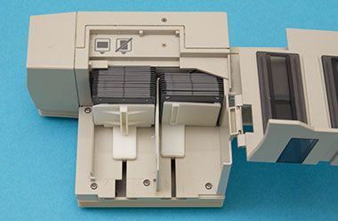 Optional gibt es einen automatischen Diawechsler. Man kann damit bis zu 50 gerahmte Dias (je nach Dicke der Rahmen) stapelweise scannen. Zusätzlich gibt es die Möglichkeit, unzerschittene lange Filmstreifen automatisch zu scannen.