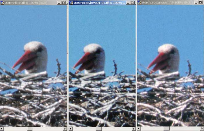 Die Detailvergrösserungen zeigen, daß der Nikon Coolscan 4000 und der Reflecta Proscan mit VueScan gute Ergebnisse bringen. Cyberview betont die Schatten. Durch die Kontrasterhöhung wirkt das Ergebnis scharf, doch die genauere Betrachtung zeigt, daß in den dunklen Partien erheblich Zeichnung verloren geht. Rechts neben dem Schnabel kann man auf dem Cyberviewscan erkennen, daß die hellen Federn bläulich werden.