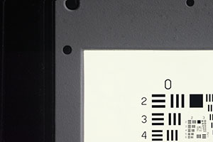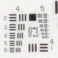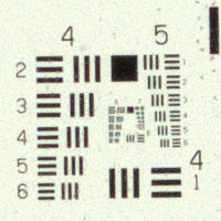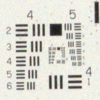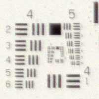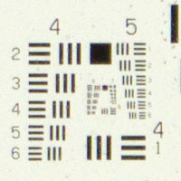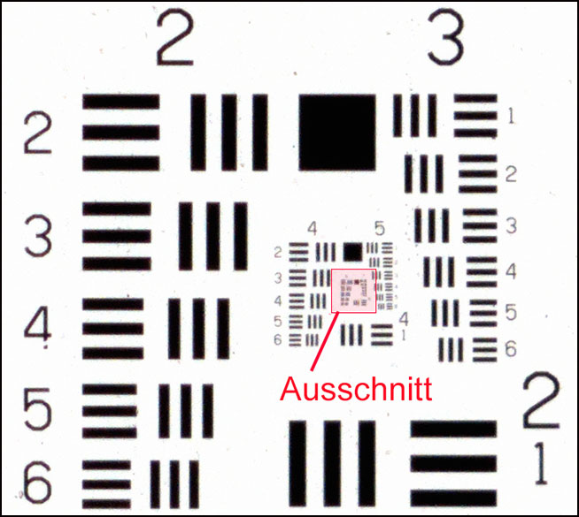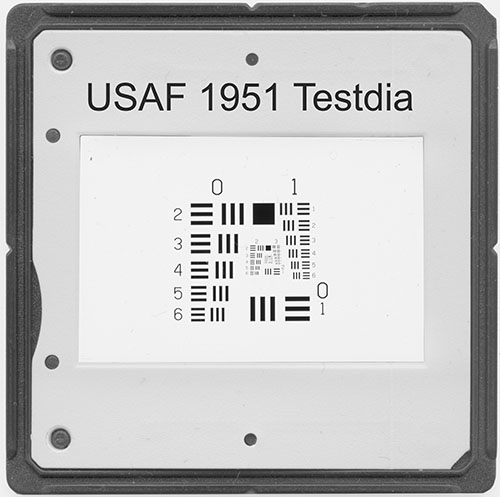 Die Auflösung von Filmscanner wird mithilfe des USAF 1951 Balkendiagramms gemessen. Konzentrisch sind acht Gruppen mit jeweils sechs kleiner werdenden Balkenreihen angeordnet. Dieses Motiv kann auch zum Ermitteln der Auflösung von Kamera/Optik Kombinationen verwendet werden.Als Kamera wurde eine Pentax K-70 mit APS-C Sensor mit 24 Megapixel eingesetzt.