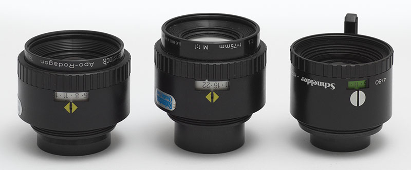 Von links nach rechts: Rodenstock Apo-Rodenstock 4/80, Rodenstock Apo-Rodenstock D 1: 4 f=75mm M1:1, Schneider-Kreuznach Componon-S 4/80