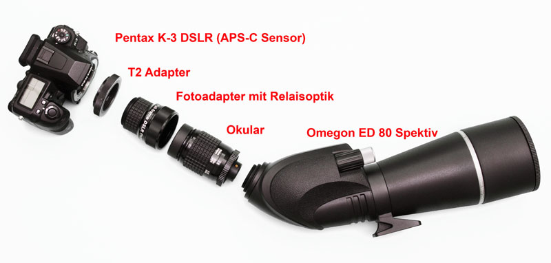 Adaptierung einer Pentax K-3 an ein Omegon ED 80 Spektiv