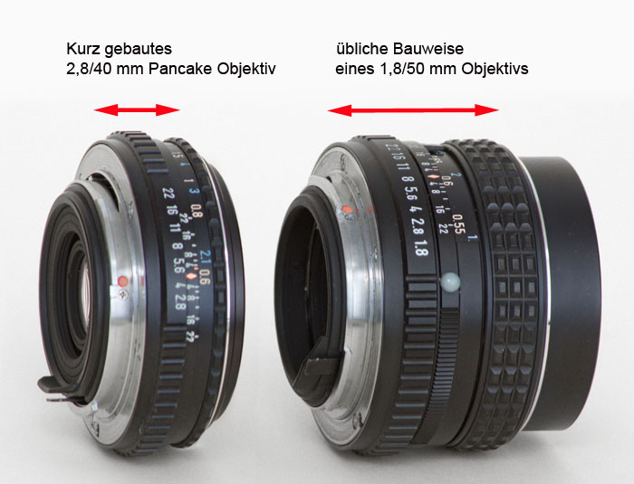 Flach gebaute Objektiv (pancake) sind vorteilhaft, weil mit ihnen analog zum Augenbastand beim visuellen Beobachten ein optimaler Abstand zwischen Okular und Fotoobjektiv eingestellt werden kann, was mit großen DSLR-Objektiven nicht immer möglich ist.