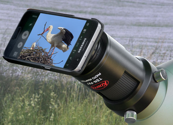 Smartphones werden gerne zum Fotografieren und Filmen genutzt. Das geht sogar mit Spektiven. Man muss nur das Objektiv des Smartphones einige Millimeter hinter das Okular halten. Die richtige Position findet man schnell heraus.Hat man das Spektiv für die Beobachtung mit dem Auge scharfgestellt, stimmt die Einstellung auch für das Smartphone, weil sein Autofokus eventuelle Korrekturen vornimmt.