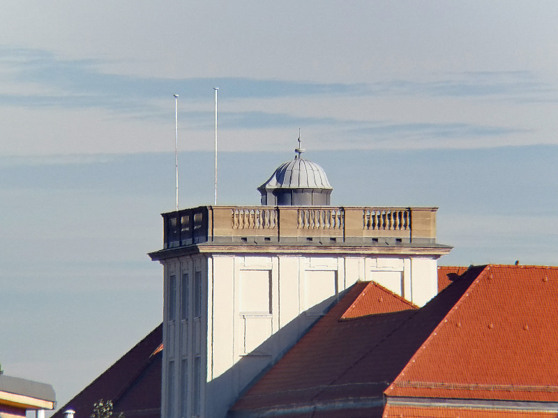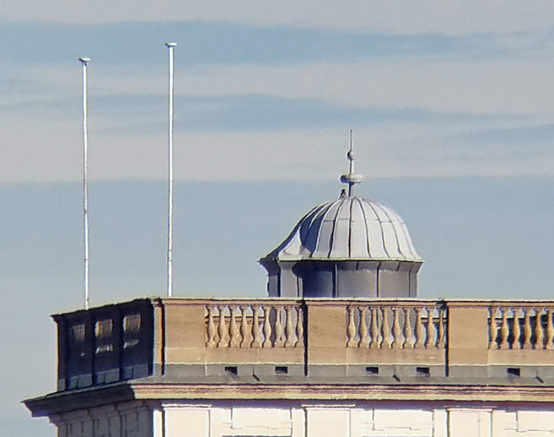 Samsung S7 mit 8x Zoom. Mein Testmotiv, ein Dach mit zwei Fahnenmasten und einer kupelförmigen Erhebung ist im unscharfen Bild zu erkennen. Der digitale Zoom erlaubt nur eine weiche, unscharfe Abbildung.