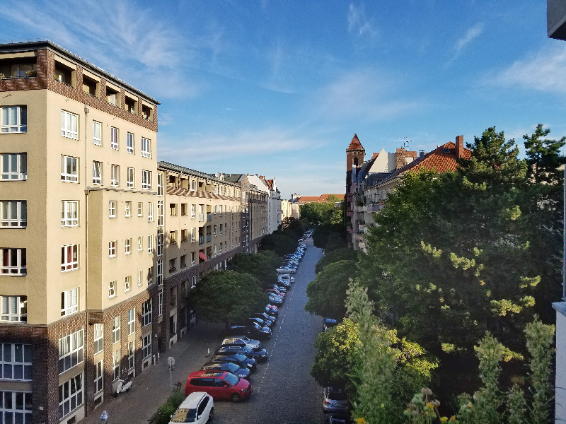 Samsung S7 ohne Zoom. Blick die Straße hinunter zu einem 800 m entfernten Hausdach.