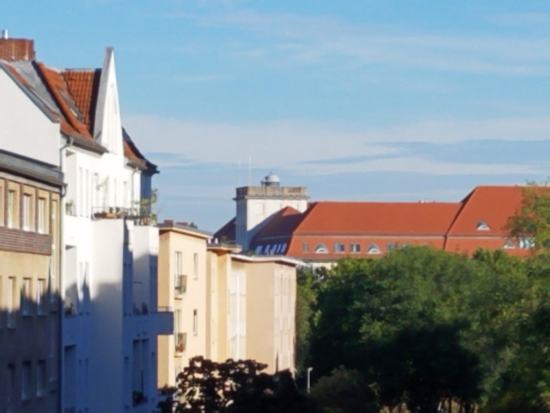 Der folgende Test wurde mit einem Samsung S7 am Mini-Spektiv von Noblex durchgeführt. Von meinem Balkon sind in etwa 800 m Entfernung auf einem Hausdach zwei Fahnenmeisten und ein kugelförmig überdachter Raum zu erkennen.