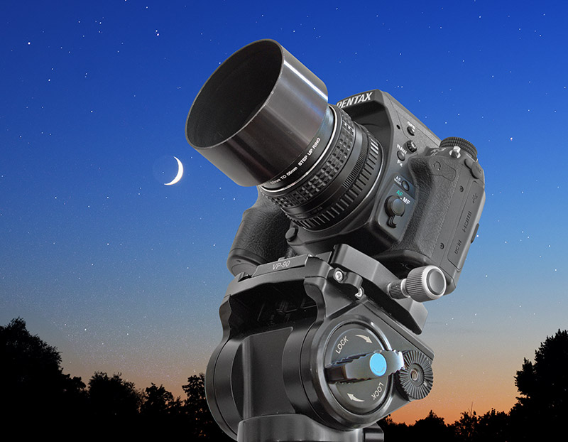 Danach wird das Spektiv durch eine Kamera ersetzt. Die hier dargestellte Pentax K3-II (DSLR) enthält eine intergrierte Startracker-Funktion (Astrotracer), so dass keine zusätzliche Nachführeinrichtung für längere Belichtungszeiten erforderlich ist.