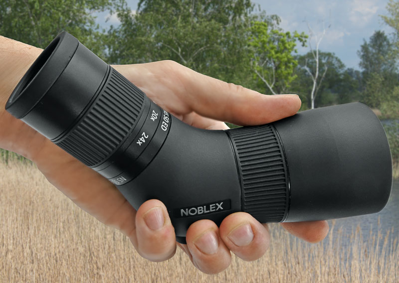 Noblex NS 8-24x50 ED. Bei Vergrößerungen bis etwa 12x kann man noch einigermaßen gut mit dem kleinen Spektiv in der freien Hand beobachten. Für höhere Vergrößerungen sollte allerdings ein Stativ verwendet werden.