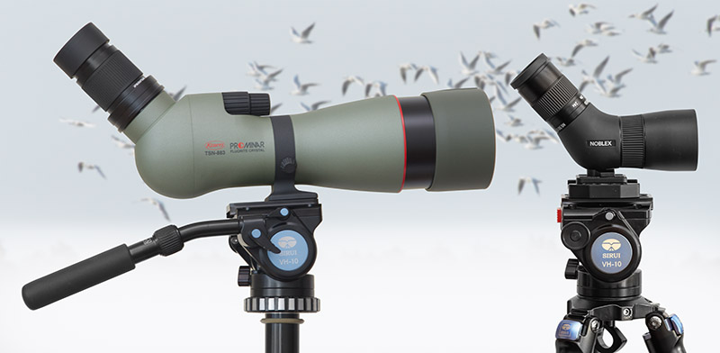 Größenvergleich: Kowa Prominar TSN-883 (88/500 mm Objektiv) neben dem Noblex NS 8-24x50 ED (50/166 mm Objektiv)