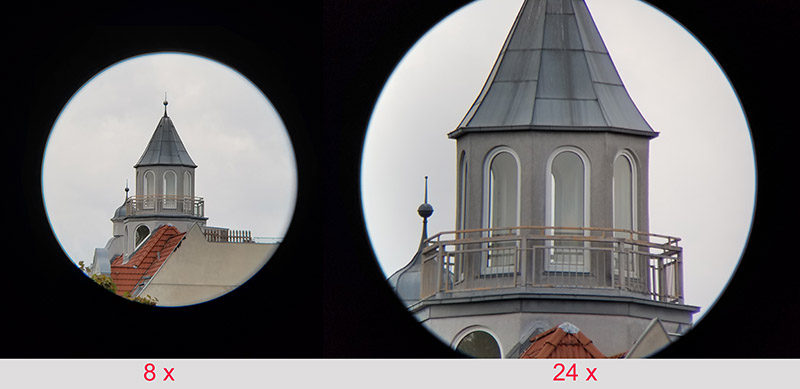 Rechts: Das Zoomobjektiv bietet eine Vergrößerung von 8-24x. Die Augenmuschel kann etwas herausgedreht werden.