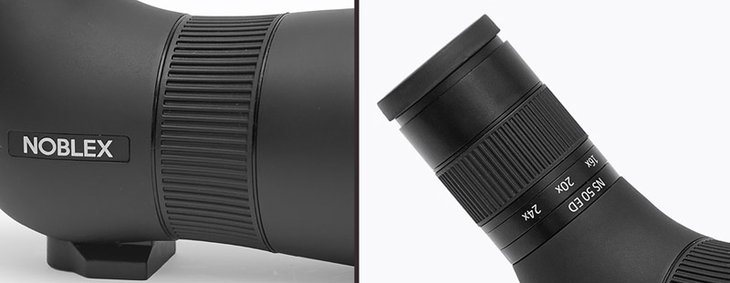 Das Objektiv des Noblex 8-24x50 ED hat eine Öffnung von 50 mm und eine Brennweite von 168 mm. Das Öffnungsverhältnis von 1 : 3,36 erlaubt eine besonders kurze Baulänge des Spektivs. Allerdings ist dieses Öffnungsverhältnis nicht so ideal für starke Vergrößerungen, weil die Unterdrückung von Farbsäumen und Kompensierung der negativen Effekte aus der Bildfeldwölbung schwieriger ist als bsp. mit 1:5,6. Durch den verhältnismäßig niedrigen Zoombereich von 8-24x ist das jedoch unproblematisch.Der sichtbare Bildkreis ist im Zoomokular bei 8x relativ klein. Sein Durchmesser vergrößert sich kontinuierlich beim Steigern der Vergrößerung. Bis etwa 20x ist die Bildqualität erstaunlich gut. Danach lässt sie etwas nach, vor allem wird das Einblick dann schwieriger, weil das Auge sehr genau an die richtigen Position sein muss. Das Nachlassen der Abbildungsqualität bei den stärksten Vergrößerungen durch Zoomen ist aber auch bei hochwertigen Spektiven normal.