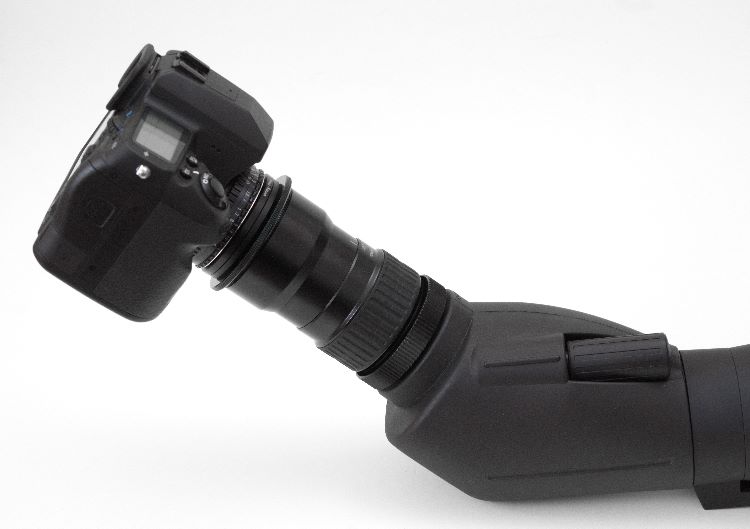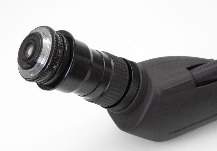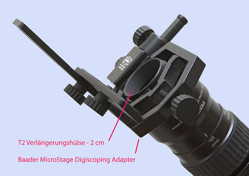 Das Zoomokular von Pentax ist für die meisten Universal-Digiscopingadapter zu dick, sodass man ihre Klemmungen nicht darüber streifen kann. Deswegen ersetzt man auch hier die Augenmuschel durch den M60/T2 Adapter und schraubt daran eine ca. 2 cm lange Verlängerungshülse. Der Adapter Baader MicroStage lässt sich gut daran festklemmen. Das Objektiv der digitalen Kompaktkamera muss in die Verlängerungshülse hineinpassen, sonst ist der Abstand zwischen dem Okular und dem Fotoobjektiv zu groß.