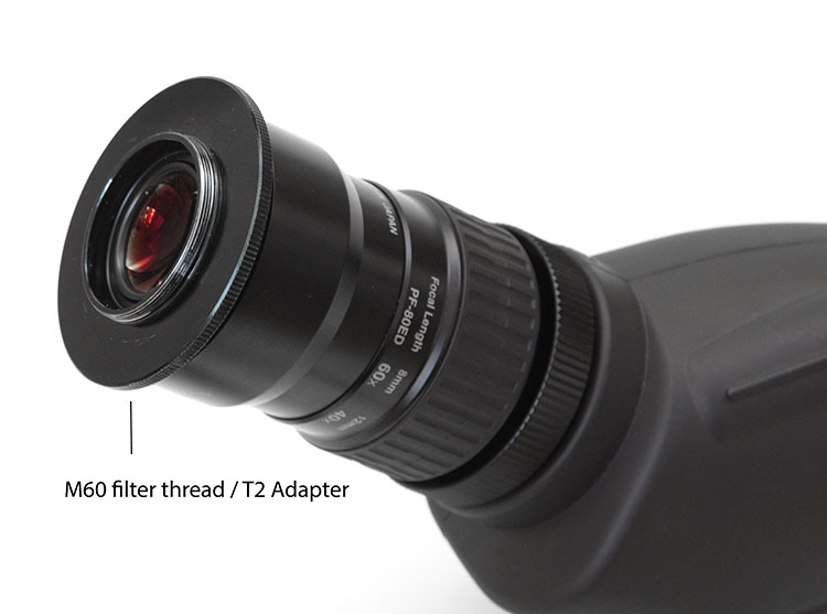 Schraubt man die Augenmuschel des Zoomokulars ab, besteht die Möglichkeit, einen Adapter mit M60 Filtergewinde auf der einen Seite und T2 Gewinde auf der anderen zum Anschluss eines Fotoobjektivs, das bei der Fotografie durch das Okular immer notwendig ist, einzusetzen. Zusätzlich brauchten wir einen T2/M49 (Filtergewindeadapter) zum Einschrauben verschiedene Testobjektive mit diesem Filteranschluss.