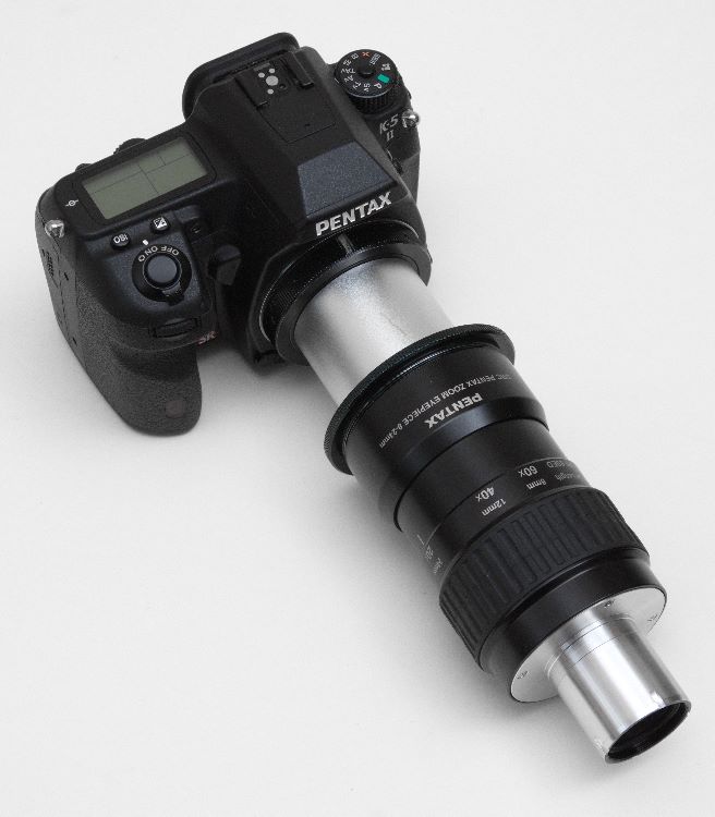 Pentax K-5 II mit T2 Verlängerungshülse am SMC Pentax Zoom Eyepiece 8-24mm (20-60x)