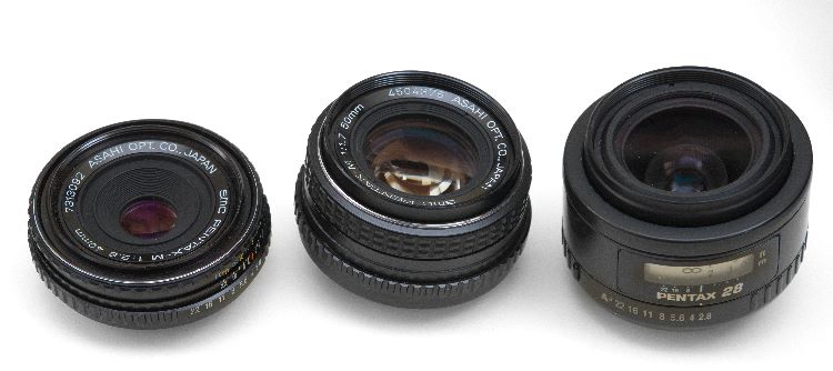 Unsere drei Testkandidaten als Relaisoptik zwischen Kamera und Okular. Pentax 2,8/28mm und 1,7/50mm und 2,8/40mm. Das 40mm Pancake ist am besten geeignet, doch nur in der Bildmitte ist die Qualität in Ordnung. Zum Rand hin lässt sie stark nach. Das 28mm Objektiv ist mit der o.g. dargestellten Adaptierung zu weit weg. Man muss es direkt an das Okular anlegen, um den besten Bildausschnitt zu erreichen, der immer noch den kreisrunden Bildrand zeigt.