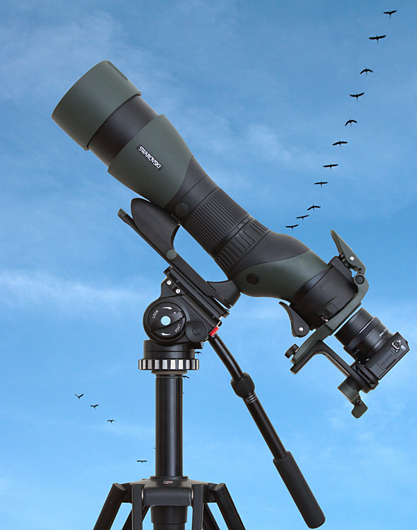 Swarovski 85mm Objektivmodul mit STX Okularmodul. Eine Nikon 1 J5 mit Nikkor 10-30mm Zoomobjektiv befindet sich am Swarovski DCB II Schwenkadapter. Die Kombination ist sehr gut zum Digiscoping geeignet. Nach grober manueller Scharfeinstellung erledigt der Autofokus der Nikon 1 J5 den Rest. Ein ausreichend dimensionierter Fluidkopf, wie der Sirui VH-10, ist ein idealer Träger der Kombination.