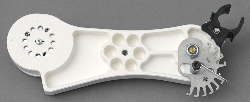 Unterseite der Omegon LX3. Eine Feder mit mehreren Rastpunkten dient zum Korrigieren der Drehgeschwindigkeit.