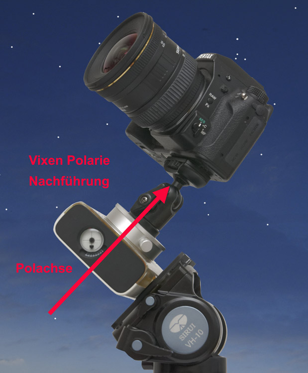 Vixen Polarie Star Tracker auf einem Fotostativ mit einer Pentax DSLR. Ein gutes Fotostativ reicht aus. Der Kopf sollte die Last des Aufbaus gut tragen. Der SRIUI VH-10 schafft das, besser ist aber der Neigekopf.