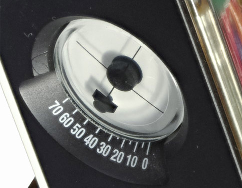 Optional gibt es den Polar Meter zum Aufstecken auf den Zubehörschuh. Er enthält einen großen Kompass mit Wasserwaage und eine genaue Skala zum Anzeigen der Neigung. Damit kann die Polarie auch dann richtig aufgestellt werden, wenn der Blick auf den Polarstern verdeckt ist. Zwar hat das Basismodul beides bereits an Bord, aber kleiner und nicht so genau.
