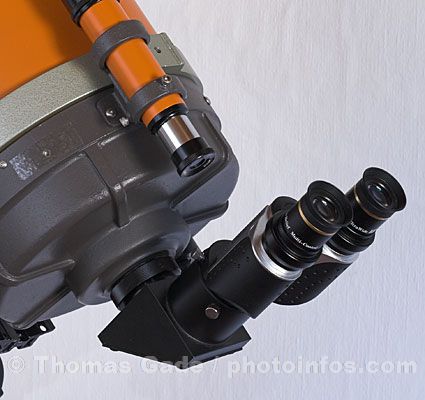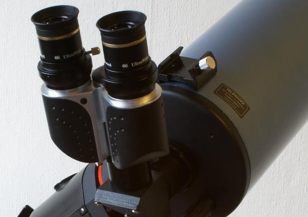 Ein 2" Zenitspiegel mit einem Denkmeier Standard Binoviewer und zwei Okularen ist schwer. Das Celestron Schmidt-Cassegrain hat eine dicke metallene Rückwand mit einem stabilen SCT-Gewinde zum Anbringen der okularseitigen Teile. Die Fokussierung erfolgt über den Hauptspiegel innerhalb des Teleskop. Das Zenitprima und der Stereoeinblick lassen sich so zurechtdrehen, wie es zum Beobachten am besten ist.