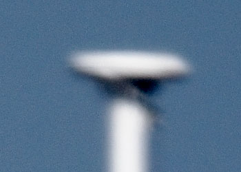 Die Bilder zeigen die enorme Reichweite des OMC 140. Dessen 2 Meter Brennweite holen weit Entferntes nahe heran. Der negative Einfluss unruhiger Luft, durch die das Licht wandert, ist bei der Brennweite beträchtlich. Ich habe das Motiv mit völlig unveränderter Einstellung zehn mal nacheinander mit Hilfe eines drahtlosen Fernauslösers und Spiegelvorauslösung durch das OMC140 auf einem sehr soliden Linhof-Stativ bei Windstille aufgenommen. Die Ergebnisse unterschieden sich stark im Detail, was die nachfolgenden Ausschnitte gut darstellen.