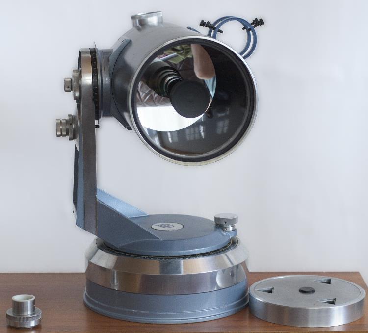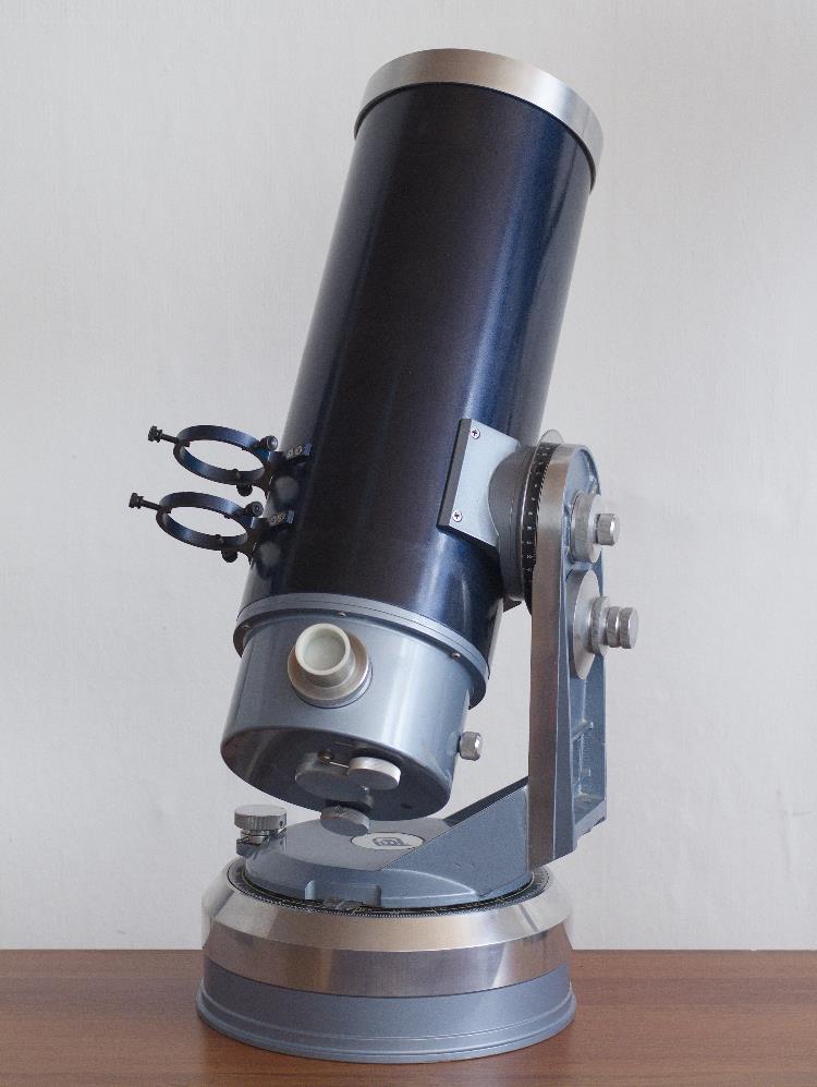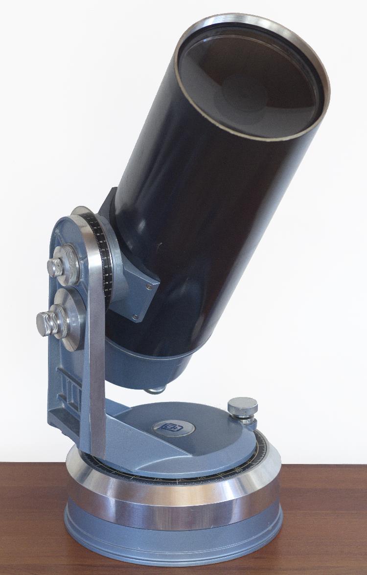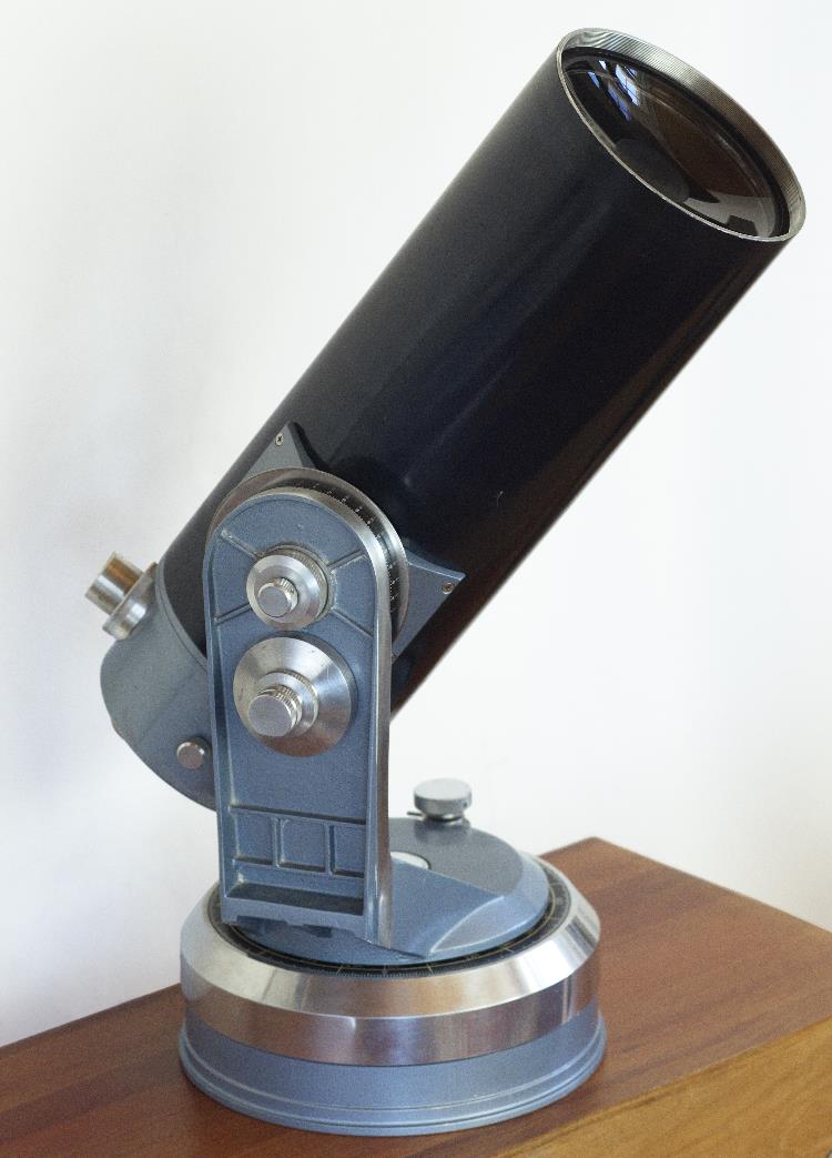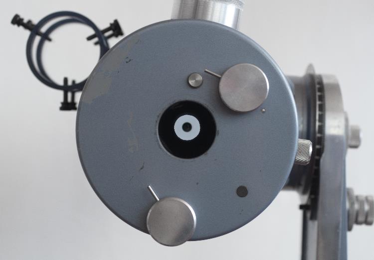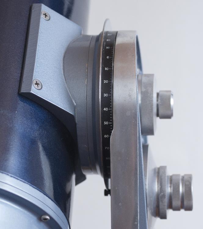 Auffällig bei dem hier stehenden Exemplar ist die Position des oberen Okularstutzens. Er ist leicht zum Arm der Gabel geneigt und zeigt nicht exakt nach oben. Das Teleskop hat keinen Schaden und es sieht nicht so aus, als ob hier jemand rumgefummelt hätte. Möglicherweise hat der Hersteller die Neigung so gewollt in der Annahme, dass der Benutzer neben der Gabel steht, weil er dort am besten an alle bedienbaren Elemente herankommt und nicht 'hinter' dem Teleskop.