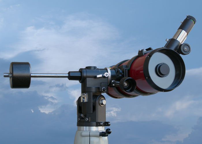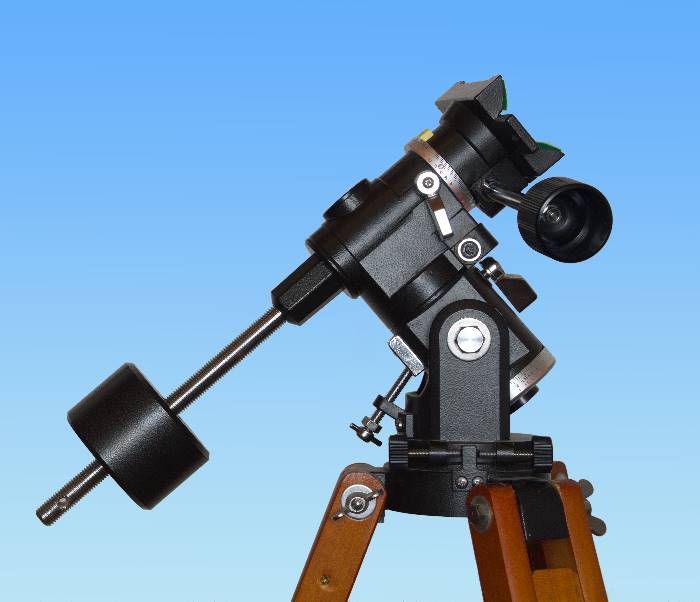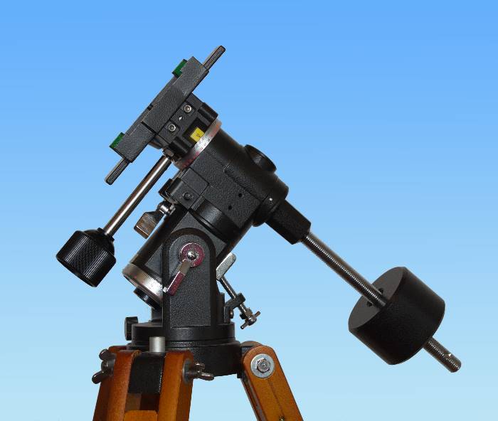 Das Gegengewicht befindet sich auf einer Gewindestange. Bei späteren Vixen-Montierungen wurde das Gewinde aufgegeben und durch eine glatte Oberfläche ersetzt. Die Gegengewichte werden dann nur auf solche Stangen geschoben und durch eine Klemme arretiert. Das ist bequemer. Der Umbau ist nicht schwer.