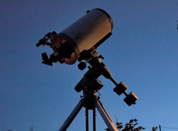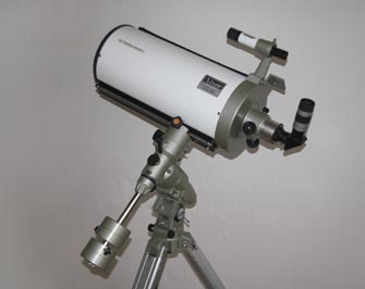 Hier sieht man ein Vixen VC200L auf einer Vixen GP. Der Tubus wiegt mit Zenitprisma und Okular ca. 7 Kilogramm und wird mit zwei mittleren Gegengewichten (je 2,8 Kilogramm) gut in Balance gehalten. Dies ist schon eine ordentliche Ausrüstung, mit der anspruchsvolle Astrofotografien gemacht werden können.