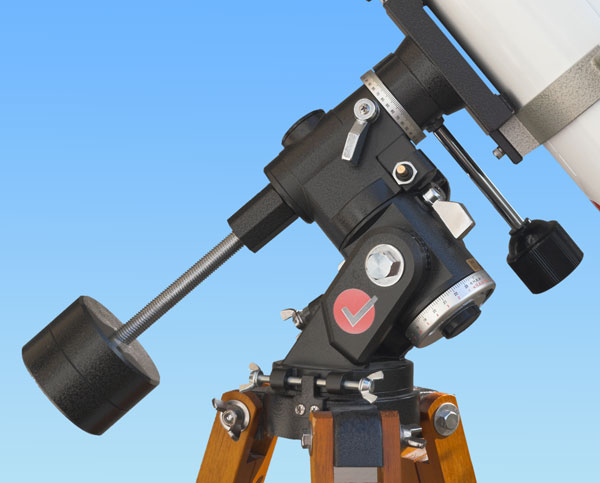 Statt einer runden Stange mit glatter Oberfläche für die Gegengewichte hat die Vixen NP eine Gewindestange. Damit dauert das Verschieben oder Ansetzen der Gegengewichte länger und man kann sich an den Rillen der Gewindegänge auch verletzen. Von dem Konzept ist Vixen bei größeren und auch an späteren Montierungen abgewichen, weil Hobby-Astronomen es nicht so gut fanden. Es hatte auch Vorteile. Die Gegengewichte können beim Lösen der Klemmung nicht von der Stange rutschen, aber das Schrauben der Gegengewichte an der Stange war den meisten einfach zu mühsam.