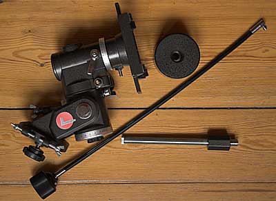 Zerlegte Montierung: Achsenkreuz, Gegengewicht, Gegengewichtsstange, flexible Welle. Die Gegengewichtsstange hat ein durchgängiges Gewinde. Das Gegengewicht wird in die richtige Position geschraubt.