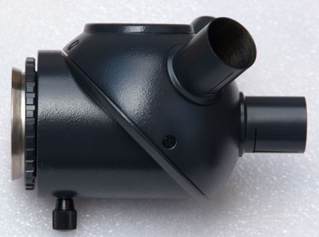 Der Okularrevolver enthält ein großes Prisma und ist für den besten Einblick drehbar. Erfreulicherweise ist das Bild seitenrichtig und aufrecht. Dadurch ist das Teleskop nicht nur für astronomische Beobachtungen gut brauchbar. Naturbeobachter dürfte das zu schätzen wissen. Die Konstruktion ist solide und präzise. Es gibt drei Gewinde füe 24,5mm Steckhülsen und ein Gewinde für M44.Montierung