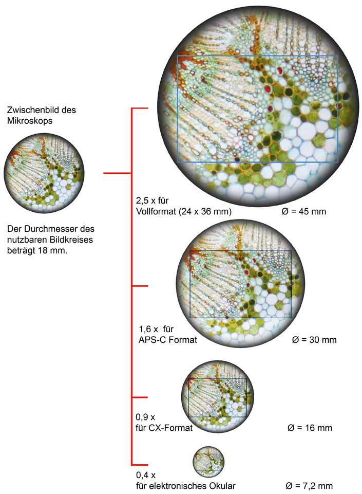 Für fotografische Zwecke soll der Durchmesser des nutzbaren Zwischenbildes oder des Bilds vom Okular so vergrößert oder verkleinert werden, dass es zur Größe eines Sensors passt.