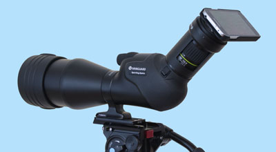Es liegt daher nahe, Spektive als starke Televorsätze zu verwenden. Diese Technik heißt Digiscoping. Dafür sind u.a. Smartphones gut geeignet, die mit ihrer 1x Zoom Kamera von der Rückseite in das Okular des Spektivs blicken. Das nennt man afokale Projektion. Das Licht wandert durch das Objektiv des Spektivs, dann durch das Okular und anschließend durch das Objektiv der Kamera. Da man inzwischen Smartphones immer dabei hat, sind sie keine zusätzliche Belastung.